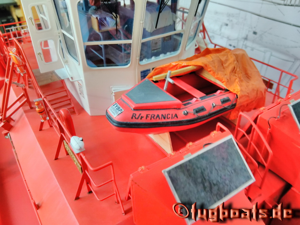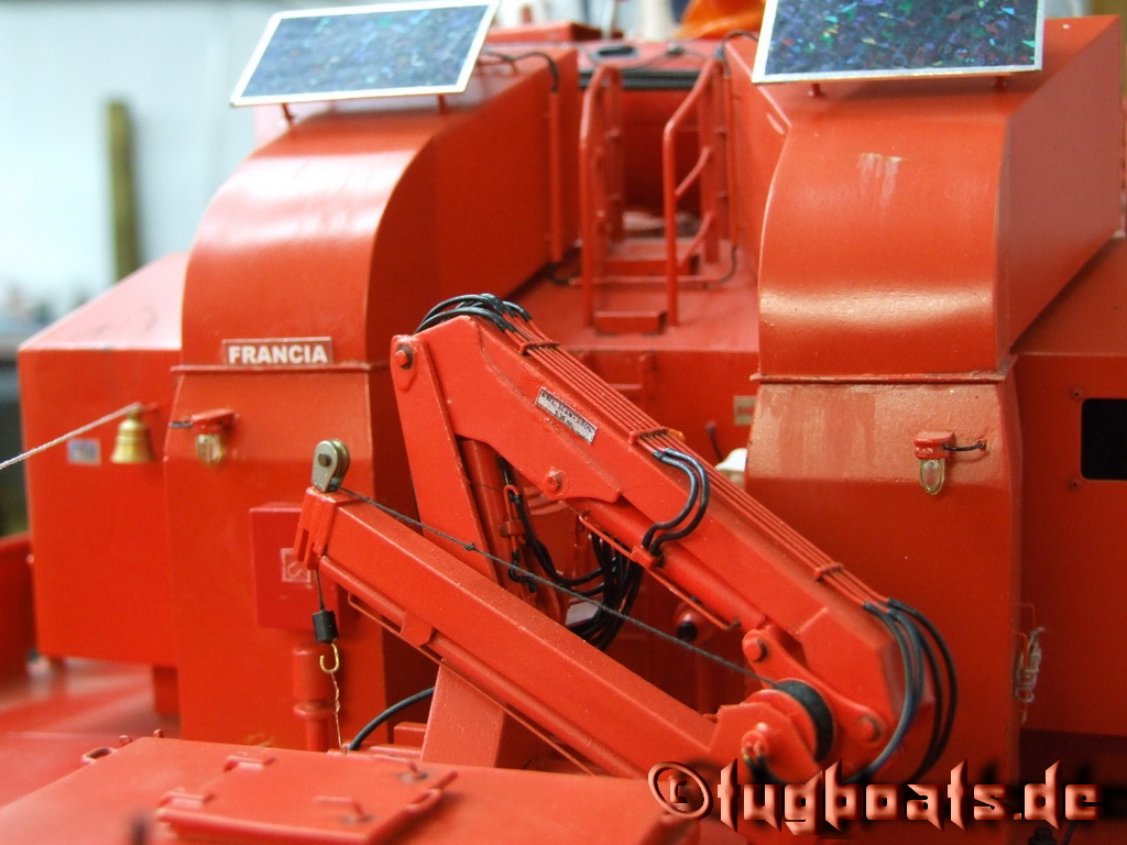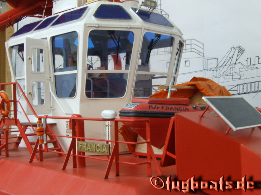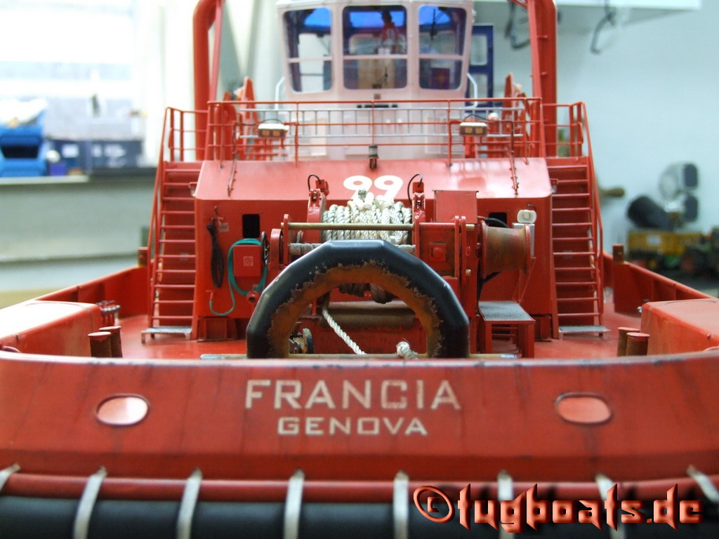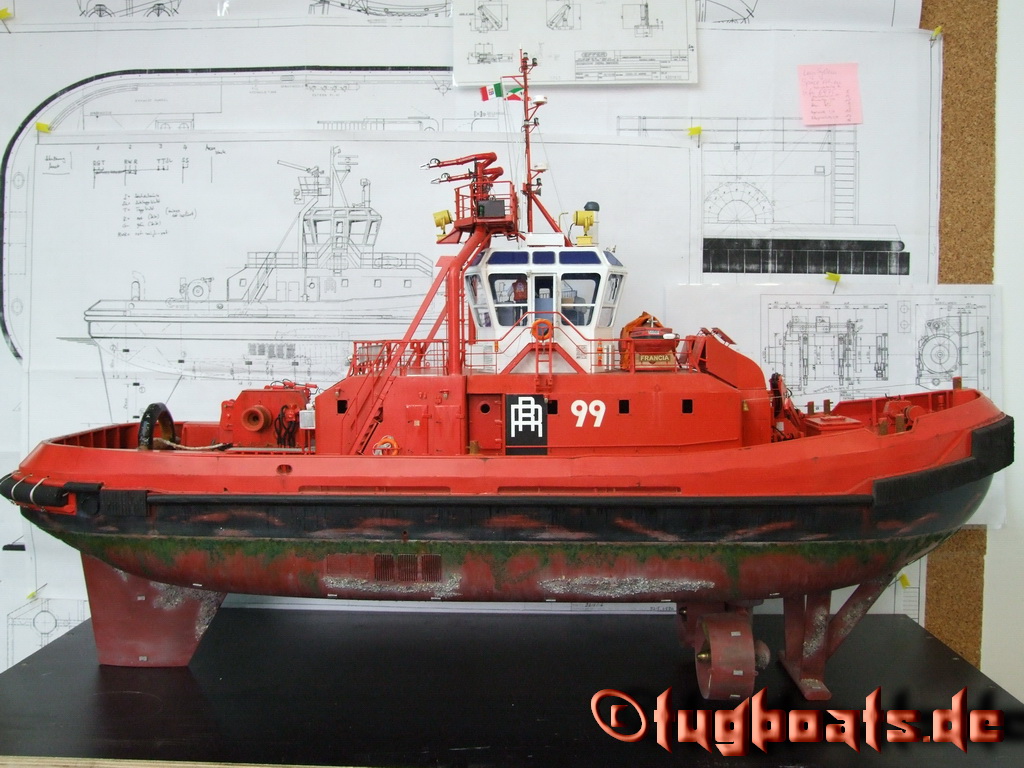 Model of the Tractor tug "FRANCIA" in scale to 1:32. This boat is owned by Rimorchiatori Riuniti and stationed in the port of Salerno/Italy.